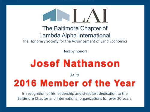 I am very pleased to nominate Josef Nathanson to be Baltimore LAI Chapter Member of the Year for 2016. Joe, founder and president of Urban Information Associates, Inc., has been a leader in Baltimore’s Lambda Alpha chapter since its beginning, active in Lambda Alpha International’s activities, and is a respected land economics professional in the Baltimore region and beyond.