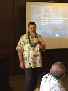 The Aloha chapter met for its quarterly luncheon meeting on December 7th at the Oahu Country Club to hear a presentation on future land development plans from Walter Thoemmes, Managing Director, Commercial Real Estate Division, of Kamehameha Schools (KS). Formally known as the Bishop Estate, KS is a charitable trust created near the end of the 19th Century by Princess Bernice Puahi Bishop, last lineal descendant of Hawaii’s kings, for the education of native Hawaiians. The res of the trust, presently valued at $11.5 billion, consists primarily of 15,000 acres of land together with some US mainland investments, $3.5 billion of which is commercial properties on about 275 sites. The trust disburses about 4% of its valuation annually to the Kamehameha School campus, one of the largest private schools in the United States, and to various outreach venues for construction, managing and funding for native Hawaiian students. Therefore a major goal is to invest and use the res of the trust to generate income for its primary educational mission. KS also sees as part of its mission the preservation and creation of economic opportunity and lifestyle for its graduates. The principal real estate development strategy currently being pursued by KS is an “urban strategy” to take advantage of investment and development opportunities at and around transit stops planned for Honolulu’s fixed guideway rapid transportation (HART) project currently under construction from its second city, Kapolei, near Pearl Harbor, to downtown Honolulu. KS is developing regional partnerships which will provide for affordable housing and infrastructure as well as commercial development. Giving its assets and nonprofit status, KS can well afford to continue to play a “long game” in developing its considerable real estate holdings, particularly on Oahu (Honolulu).”