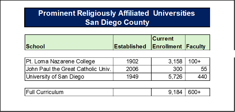 The other nine universities have a total of approximately 20,000 students.  The three largest of these institutions are National University, University of San Diego and Pt. Loma Nazarene College. The newest of the universities is John Paul the Great Catholic University, founded in 2006, based in Escondido and with a current enrollment of 300 students.