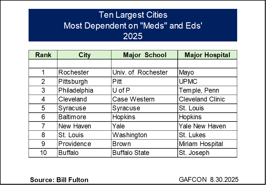 Renowned Urban Planner and UC San Diego Faculty member Bill Fulton recently developed an extensive analysis of the major U.S. metropolises whose economies heavily rely on employment in Health Care and Education   i.e.: Meds and Eds.