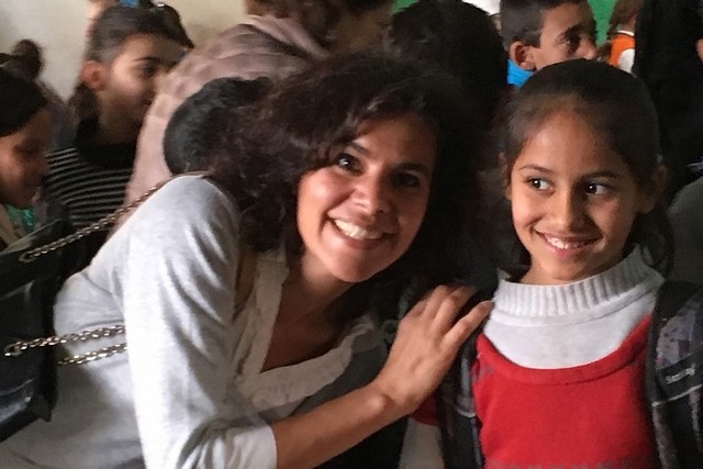 Rudayna Abdo, founder of NGO Thaki, posing with a Syrian child at a Social Support Society school in the Bekaa Valley in Lebanon. Thaki seeks to provide laptops from donors to centres educating refugee and disadvantaged children in Lebanon and Jordan.